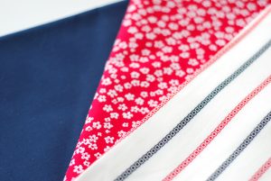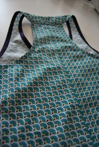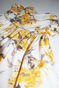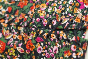 Bustier sur mesure en coton motif fleuri avec des découpes marquées par du biais en satin noir.